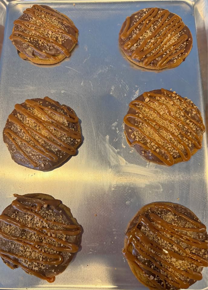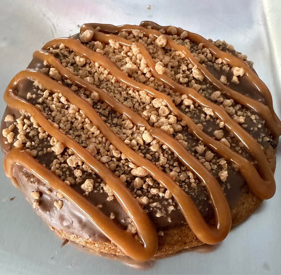 3 oz. Chewy chocolate chip cookies with premium milk, dark and semi sweet chocolate, salted caramel crumb topping, dipped in milk chocolate with caramel drizzle.
